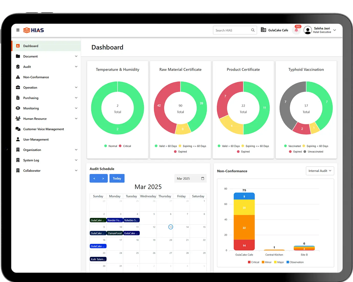 HIAS is a Software-as-a-Service (SaaS) solution designed for Halal-certified companies that need to comply with increasingly complex standards like HAS, GMP, HACCP, ISO, and ESG. It replaces spreadsheets, filing cabinets, and last-minute audit prep with a fully integrated digital system that simplifies day-to-day compliance, internal audits, certification readiness, and regulatory reporting.